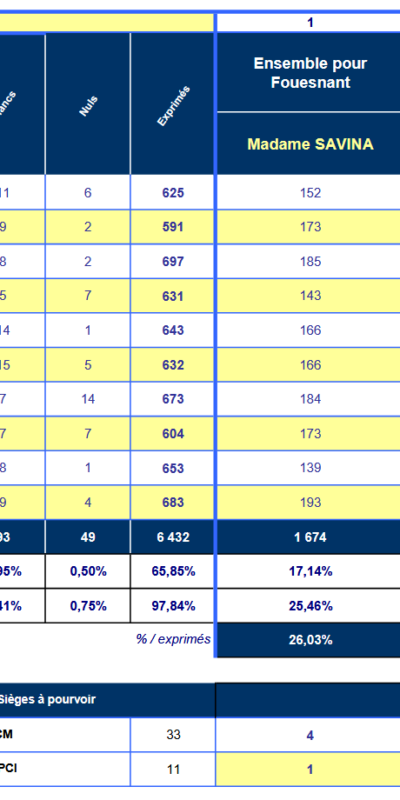 Fouesnant-les Glénan, un patrimoine naturel exceptionnel À la Une Grandes marées Conseil municipal du 21 mars 2026 10h00 Élections municipales – Résultats du 1er tour Camps d’été 2026 Toutes les actualités Menus du restaurant scolaire Associations Jours de marché Comptes-rendus des conseils municipaux Agenda 6Oct28MarTurquiel’Archipel 17Jan18AvrAutant, le temps.l’Archipel 11Mar25MarPrix du public – Les yeux docl’Archipel 18MarZoul’Archipel 21MarConseil municipal du samedi 21 mars 202610 H 00 Tout l'agenda