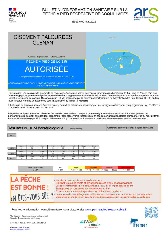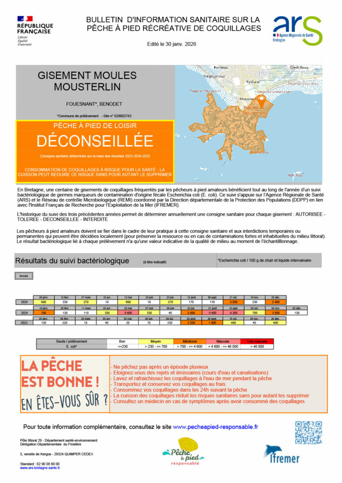 Publié le 5 février 2026Depuis le 2 février 2026, la pêche à pied de loisir est déconseillée à la pointe de Mousterlin. Consultez les informations de l’ARS et de la Préfecture : https://ville-fouesnant.fr/qualite-sanitaire-coquillages/