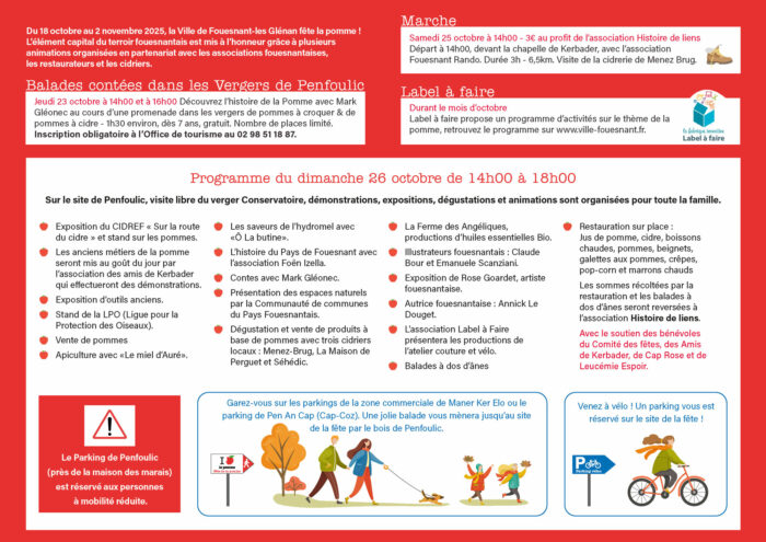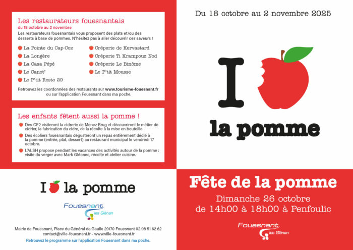 Publié le 6 octobre 2025Du 18 octobre au 2 novembre 2025, la Ville de Fouesnant-les Glénan fête la pomme ! L’élément capital du terroir fouesnantais est mis à l’honneur grâce à plusieurs animations organisées en partenariat avec les associations fouesnantaises, les restaurateurs et les cidriers.