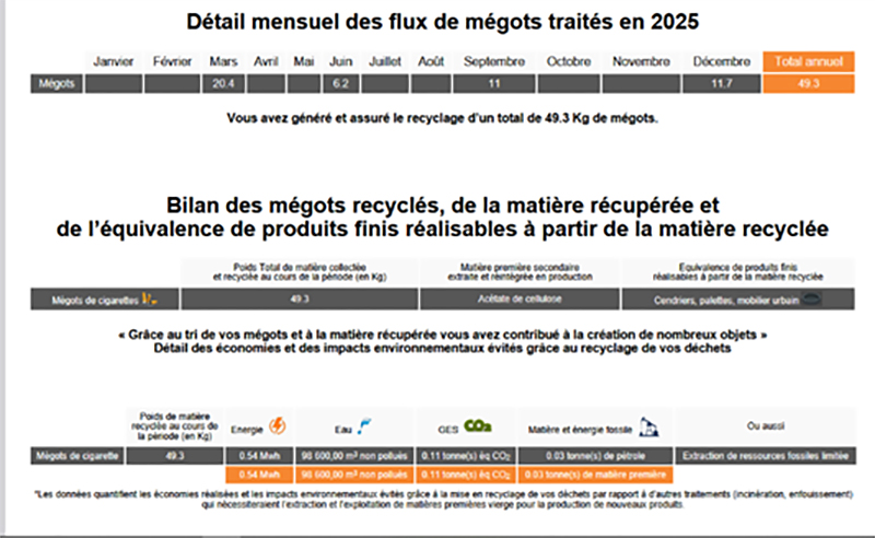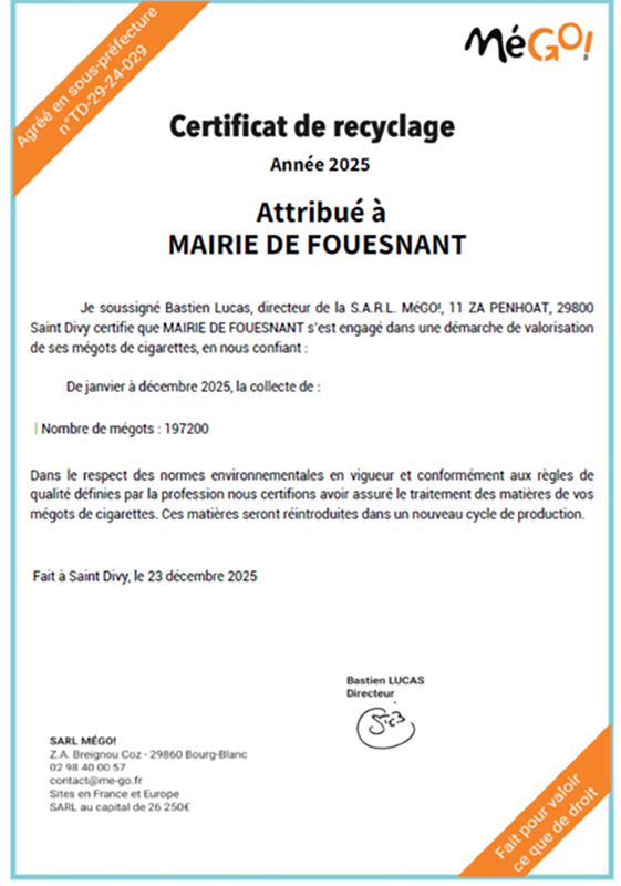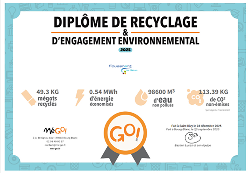 En 2025, la commune a récolté et permis de recycler 49,3 kg de mégots grâce à son partenariat avec l’entreprise MéGO. Cette initiative contribue à la réduction de la pollution et à la valorisation des déchets.