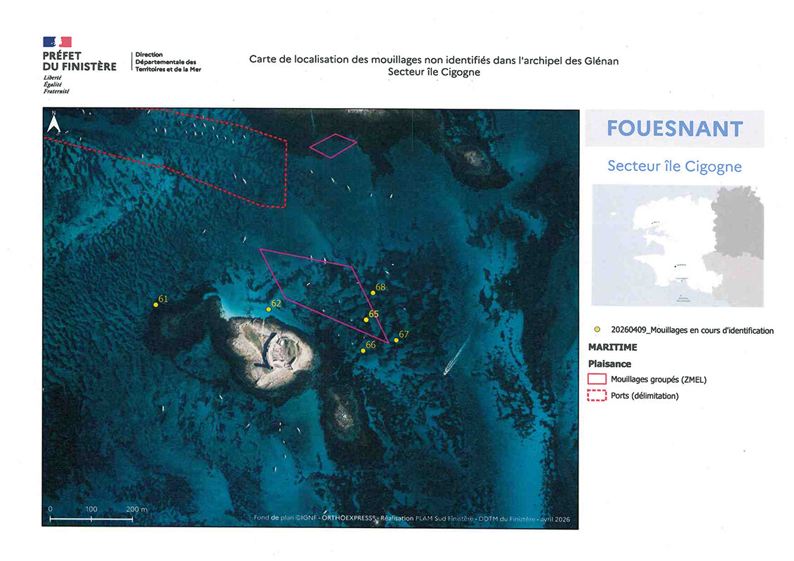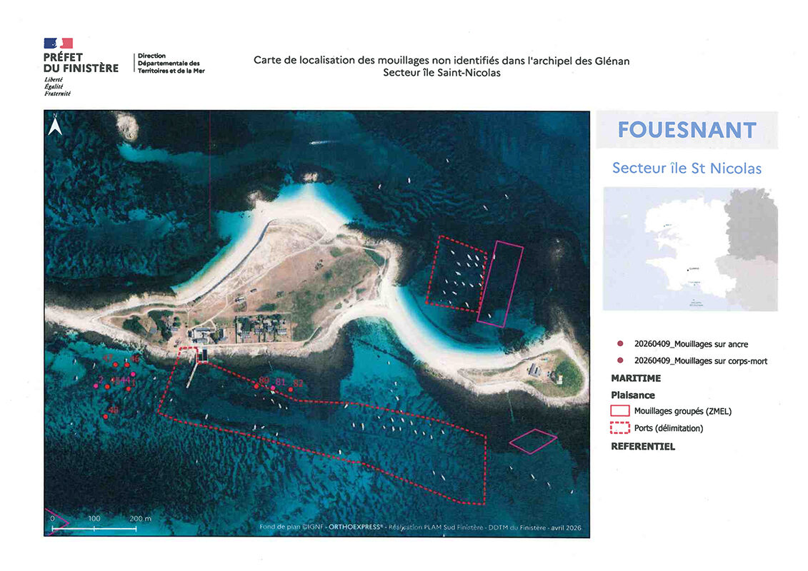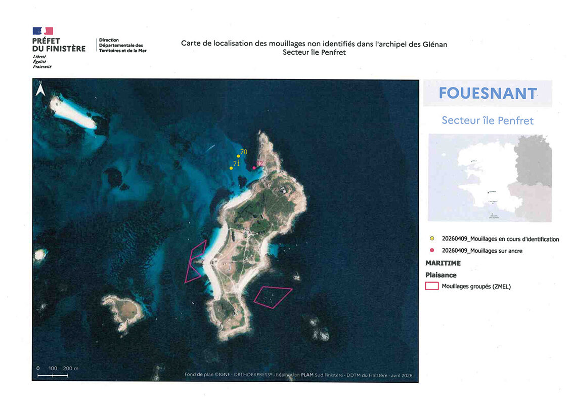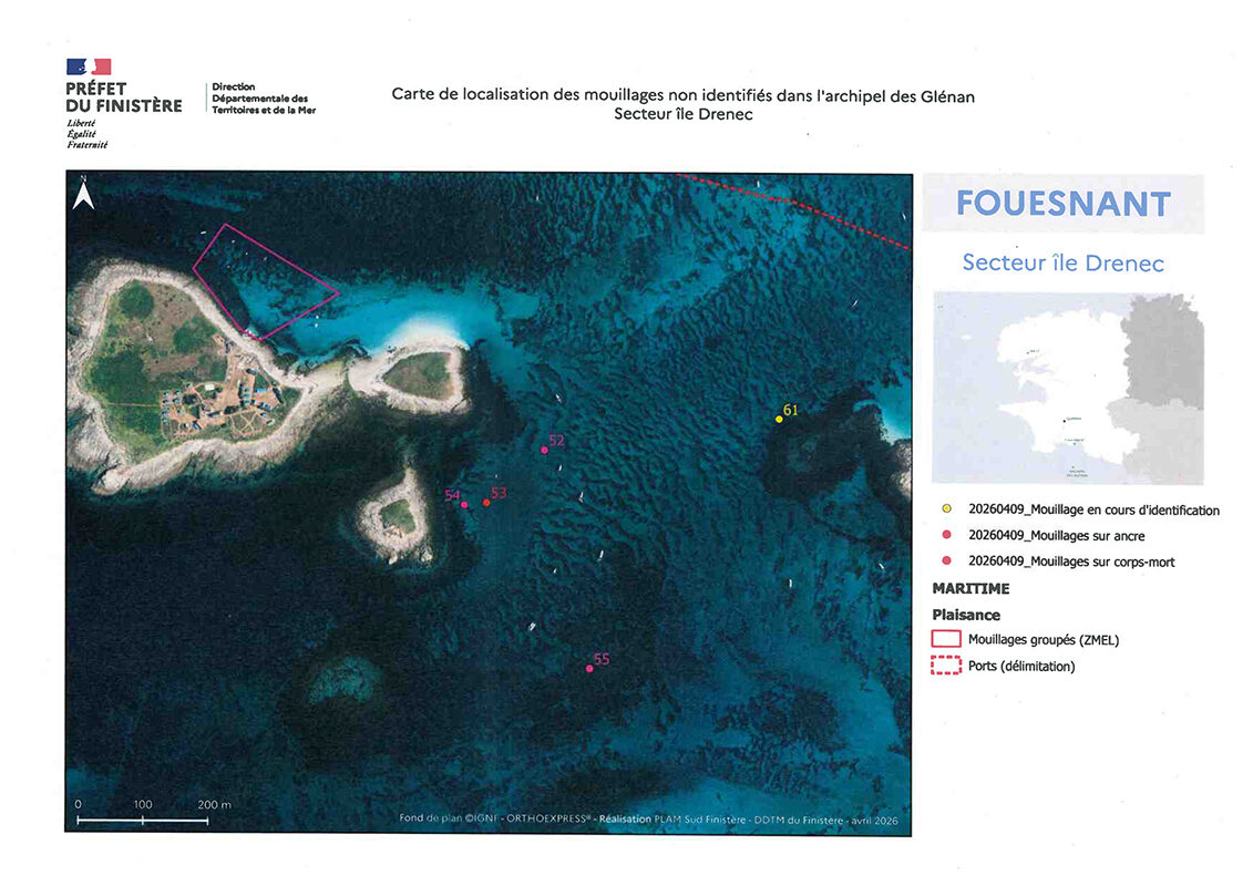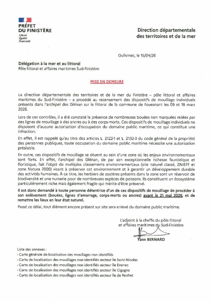 Ainsi, suite à un recensement des mouillages sans titres d’occupation effectué dans l’archipel des Glénan en mars 2026, les propriétaires de ces équipements sont désormais invités à procéder à leur enlèvement avant le 21 mai 2026.