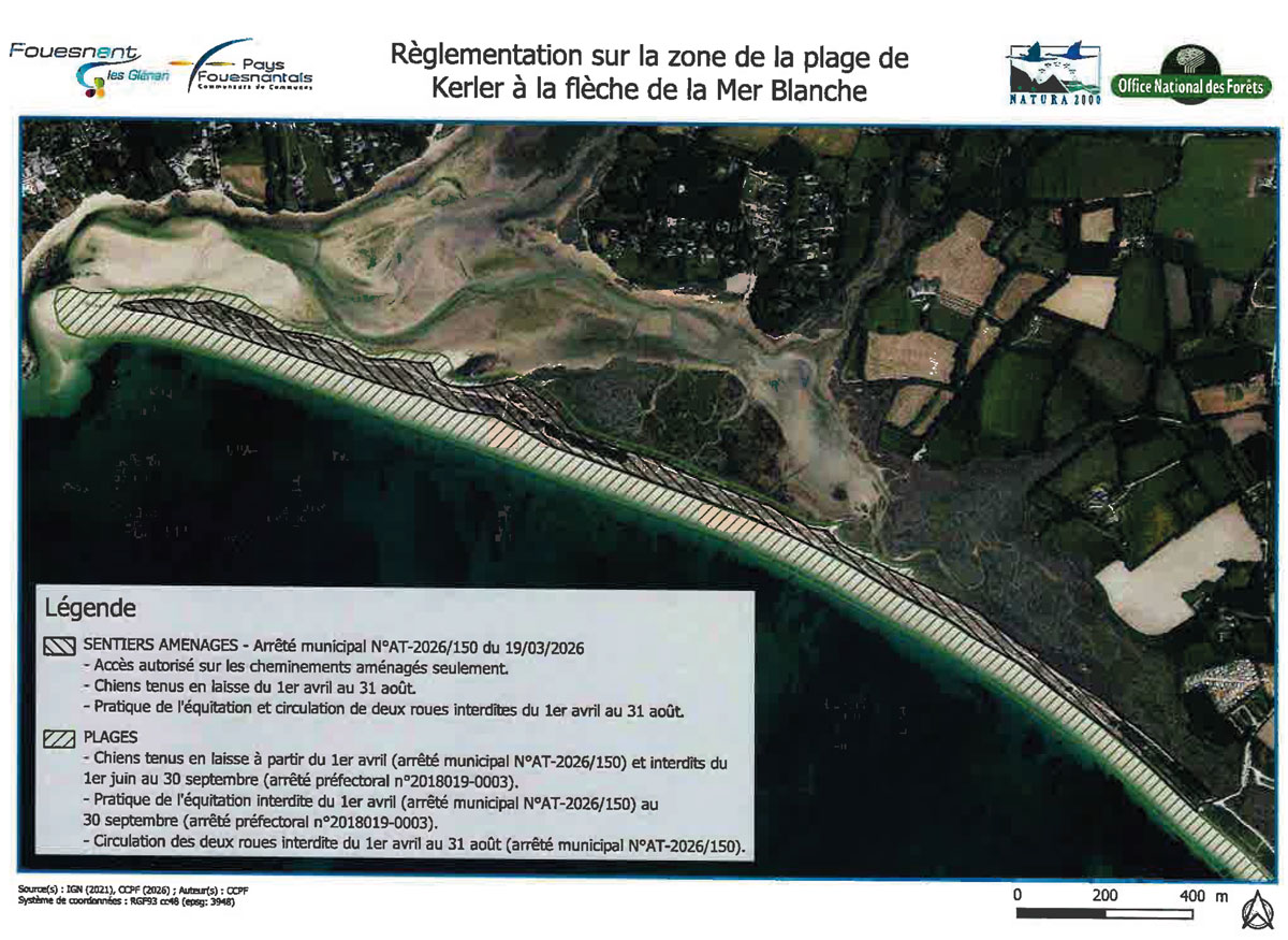 Considérant que la flèche de La Mer Blanche est confrontée à une forte érosion dunaire et que la nidification du gravelot à collier interrompu a lieu sur la totalité de la plage de Kerler ainsi que sur la flèche de la Mer Blanche dès le début du mois d’avril, la ville de Fouesnant a pris comme chaque année un arrêté municipal afin de réglementer du 1er avril au 31 août 2026 l’accès et les usages sur la zone naturelle de la plage de Kerler jusqu’à la Flèche de la Mer Blanche :